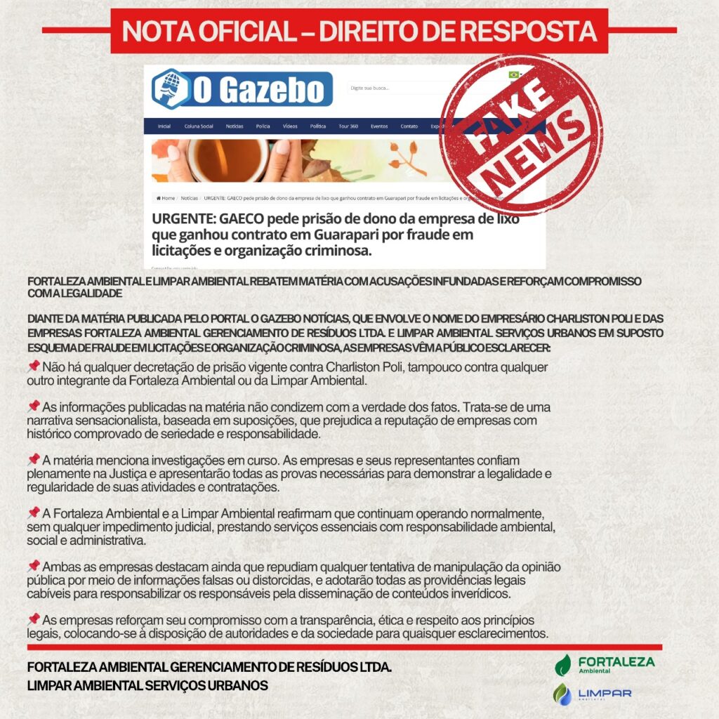 Em resposta à matéria publicada recentemente pelo site O Gazebo, que traz graves acusações contra o empresário Charliston Poli e as empresas Fortaleza Ambiental Gerenciamento de Resíduos Ltda. e Limpar Ambiental Serviços Urbanos, ambas as organizações vieram a público esclarecer os fatos e rebater, de forma veemente, as informações divulgadas.