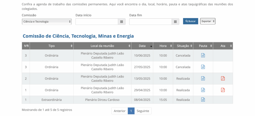 No site da Assembleia Legislativa do Espírito Santo, a seção ‘Atividade Legislativa‘ — que exibe de forma transparente as agendas, pautas e atas taquigráficas das comissões — comprova o esvaziamento da Comissão de Ciência e Tecnologia.