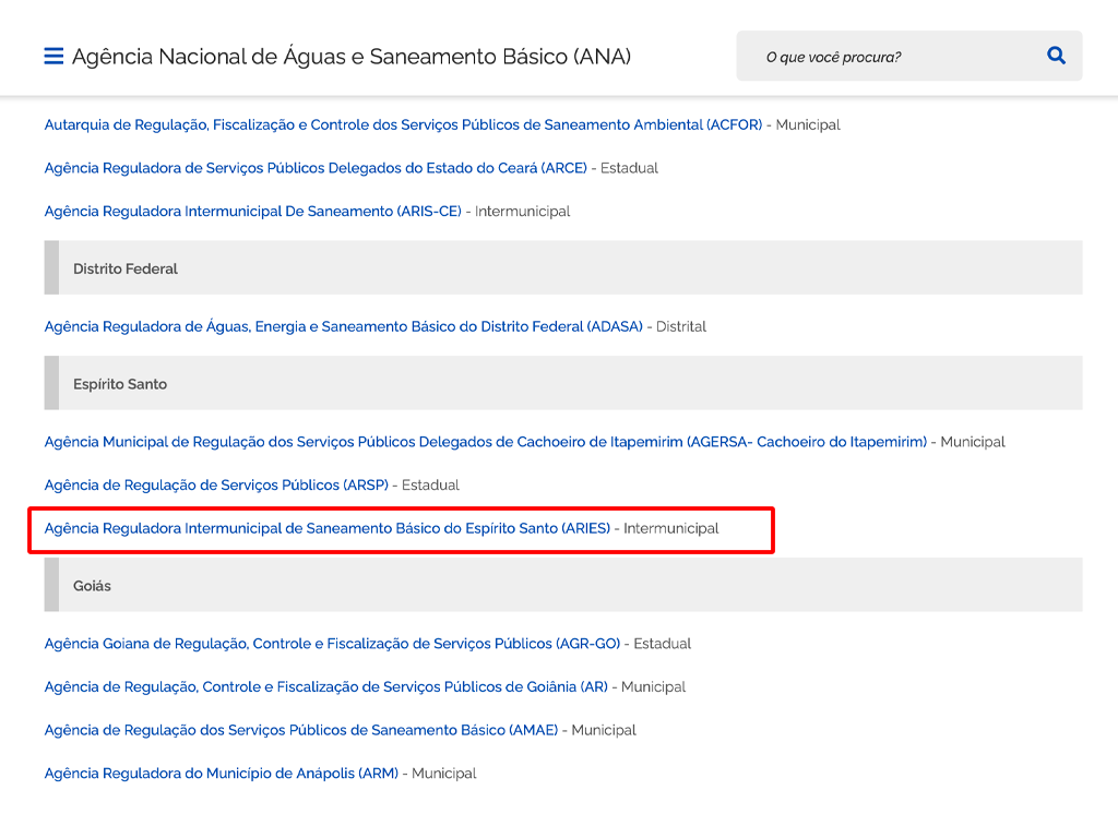 A ARIES continua ativa e reconhecida oficialmente pela Agência Nacional de Águas e Saneamento Básico (ANA) como entidade reguladora infranacional. Conforme mostra o print anexo, retirado do site oficial da ANA, a agência aparece listada entre os órgãos reguladores do Espírito Santo, ao lado da ARSP e de outras instituições.